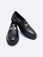 The upper is adorned with a signature champagne-gold horsebit detail, offering a nod to traditional Italian craftsmanship. To ensure versatility and durability, the shoe is set on a contoured lug sole, providing a bold profile and superior grip for the modern urban landscape. Whether paired with tailored trousers or dark denim, these loafers are a testament to bold, uncompromising style.
