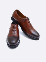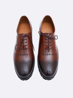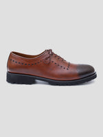 Redefine your formal wardrobe with a shoe designed for the man on the move. These hand-burnished cognac brogues feature a deep, multi-tonal patina that transitions beautifully from a warm amber to a smoky espresso toe. Unlike traditional patterns, these shoes feature a bespoke circular punching along the quarters and medallion toe, offering a fresh, artistic take on a classic silhouette.